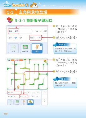 5-3 主角與食物登場 5-3-1 設計猴子與出口 1 從「角色」區,選進 「Monkey」,命名為 【猴子】。 2 把「尺寸」設為【25】。 小提示 由於要在迷宮中移動,所 以「尺寸」不能太大。 3 從「角色」區,選進 「Bananas」,命名為 【出口】。 4 把「尺寸」設為【50】。 小提示 猴子碰到「出口」,就是 到達終點了。 110