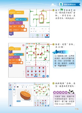 5 我的創意迷宮 5 按下 【綠旗】測 試,果然猴子碰到「食 物」,會有音效,並 且會消失,測試成功。 6 接著,複製「食物」 共 10 個。 小提示 在大量複製之前,記得要 做測試,確定沒問題再複 製。否則一旦有問題,就 得一個一個修改,或是刪 掉,再重新複製。 7 換掉幾個「食物」造 型,讓畫面更有變化。 貓熊老師說 只要到「造型」區選不同 的食物造型進來,就可以 變得不一樣了喔!這裡選 的是 Orange2-b 的造型。 115