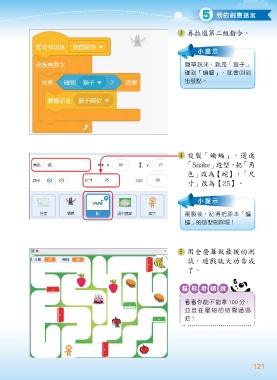 5 我的創意迷宮 3 再拉進第二組指令。 小提示 簡單說來,就是「猴子」 碰到「蝙蝠」,就會回到 出發點。 4 複製「蝙蝠」,選進 「Snake」造型,把「角 色」改為【蛇】,「尺 寸」改為【25】。 小提示 複製後,記得把原本「蝙 蝠」的造型刪除喔! 5 用全螢幕做最後的測 試,遊戲就大功告成 了。 貓熊老師說 看看你能不能拿 100 分, 並 且 在最 短 的 時間 通 過 吧! 121