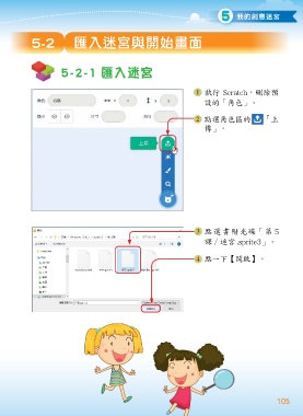5 我的創意迷宮 5-2 匯入迷宮與開始畫面 5-2-1 匯入迷宮 1 執行 Scratch,刪除預 設的「角色」。 2 點選角色區的 「上 傳」。 3 點選書附光碟「第 5 課∕迷宮 .sprite3」。 4 點一下【開啟】。 105