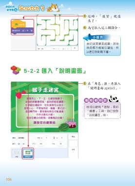 5 這時,「迷宮」就進 來了。 6 為它拉入這二個指令。 小提示 由於迷宮算是底圖,其他 角色都不能被它蓋住,所 以把它移到最下層。 5-2-2 匯入「說明畫面」 1 在「角色」區,再匯入 「說明畫面 .sprite3」。 貓熊老師說 也可以使用「造型」區的 「繪圖」工具,自己設計 「說明畫面」哦。 106
