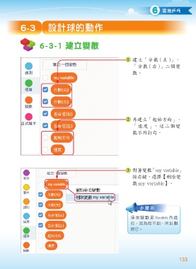 6 雪地乒乓 6-3 設計球的動作 6-3-1 建立變數 1 建立「分數 ( 左 )」、 「分數 ( 右 )」二個變 數。 2 再建立「起始方向」、 「速度」,這二個變 數不用打勾。 3 對著變數「my variable」 按右鍵,選擇【刪除變 數 my variable】。 小提示 這 個 變 數 是 Scratch 內 建 的,因為用不到,所以刪 除它。 133