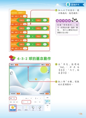 6 雪地乒乓 7 加入以下的指令,讓 分數越高、速度越快。 貓熊老師說 對著「等待直到 <>」指 令,按滑鼠右鍵,選擇「複 製」,就可以複製與設定 變數的指令哦! 6-3-2 球的基本動作 1 在「 角 色 」 區 選 進 「Ball」, 命 名 為 【球】,「尺寸」設 為【50】。 2 把二個「分數」變數 的位置調整好。 135