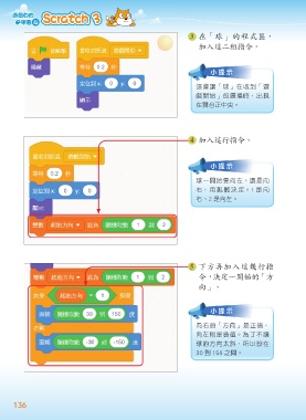 3 在「球」的程式區, 加入這二組指令。 小提示 這會讓「球」在收到「遊 戲開始」的廣播時,出現 在舞台正中央。 4 加入這行指令。 小提示 球一開始要向左、還是向 右,用亂數決定。1 是向 右、2 是向左。 5 下方再加入這幾行指 令,決定一開始的「方 向」。 小提示 向右的「方向」是正值, 向左則是負值。為了不讓 球的方向太斜,所以設在 30 到 150 之間。 136