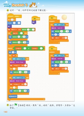 4 這時,「球」的所有程式就像下圖這樣。 5 按下 【綠旗】測試,果然「球」碰到「底線」會暫停,且會扣「生 命值」。 140