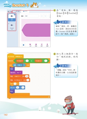 3 在「音效」區,選進 【Alert】和【Doorbell】 音效。 小提示 碰到「球拍」時,要播放 Alert 音效,增加扣分的感 覺。Doorbell 音 效 是 準 備 給下一個「角色」使用。 4 加入第二組指令,進 行「碰到右拍」的判 斷。 小提示 「獅鷲」碰到「右拍」時, 右邊的分數、生命值都要 減少。 142