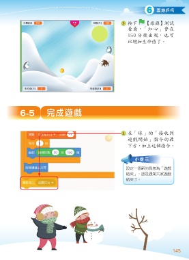 6 雪地乒乓 5 按下 【綠旗】測試 看看,「紅心」會在 150 分後出現,也可 以增加生命值了。 6-5 完成遊戲 1 在「球」的「接收到 遊戲開始」指令的最 下方,加上這個指令。 小提示 設定一個新的訊息為「遊戲 結束」,這是通知大家遊戲 結束了。 145