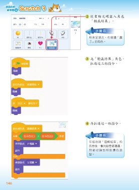 2 從書附光碟匯入角色 「輸贏結果」。 小提示 用來呈現左、右哪邊「贏 了」的角色。 3 為「輸贏結果」角色, 拉進這三組指令。 4 再拉進這一組指令。 小提示 在接收到「遊戲結束」的 訊息後,會判斷是哪邊贏, 然後切換到相對應的造 型。 146