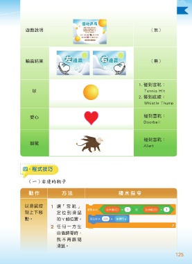 6 雪地乒乓 遊戲說明 (無) 輸贏結果 (無) 1. 碰到雪靴: 球 Tennis Hit 2. 碰到底線: Whistle Thump 愛心 碰到雪靴: Doorbell 碰到雪靴: 獅鷲 Alert 四、程式技巧 ( 一 ) 右邊的靴子 動作 方法 積木指令 以滑鼠控 1 讓「雪靴」 制上下移 定位到滑鼠 動。 的 Y 軸位置。 2 任何一方生 命值歸零時, 就不再跟隨 滑鼠。 125